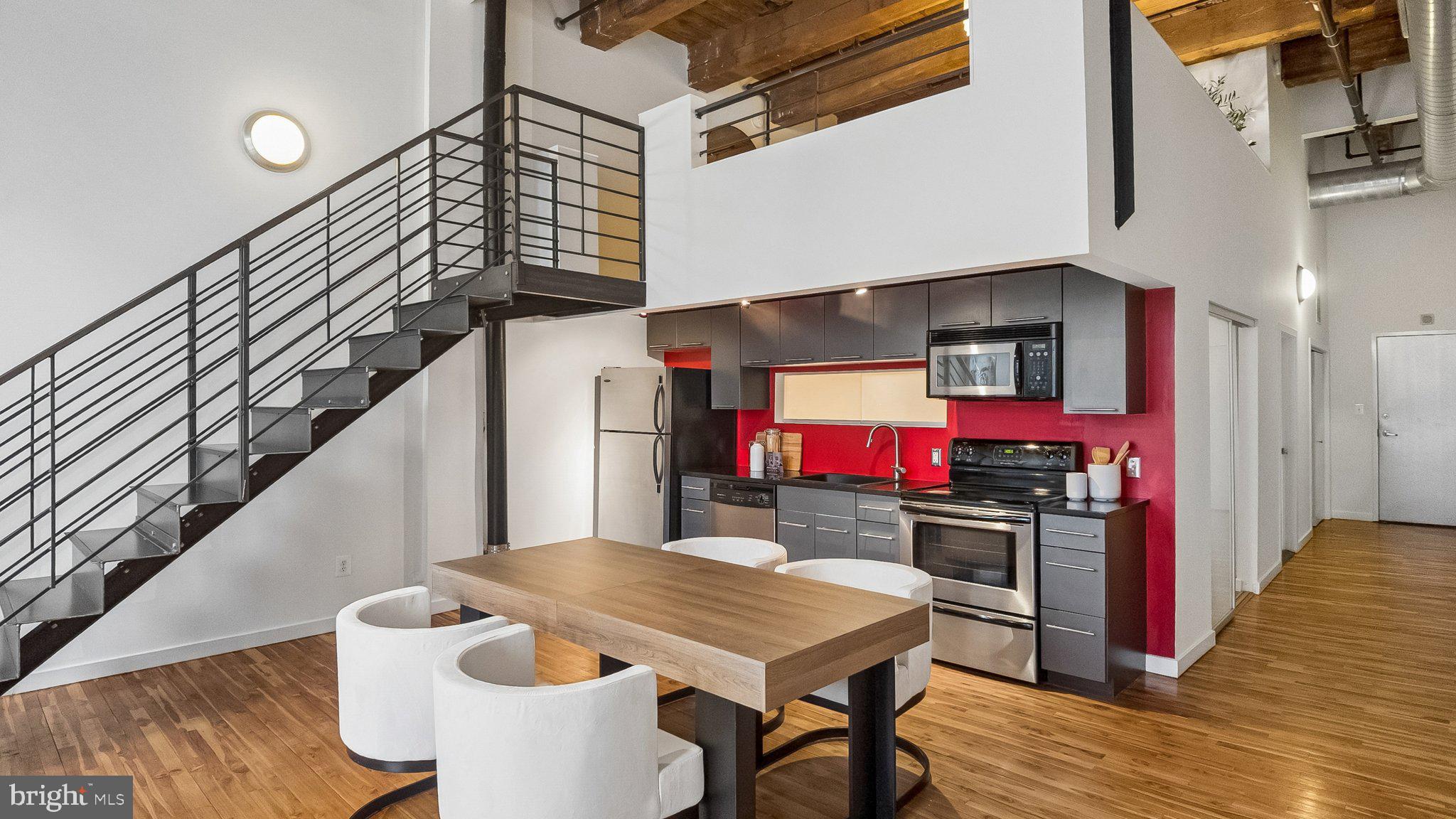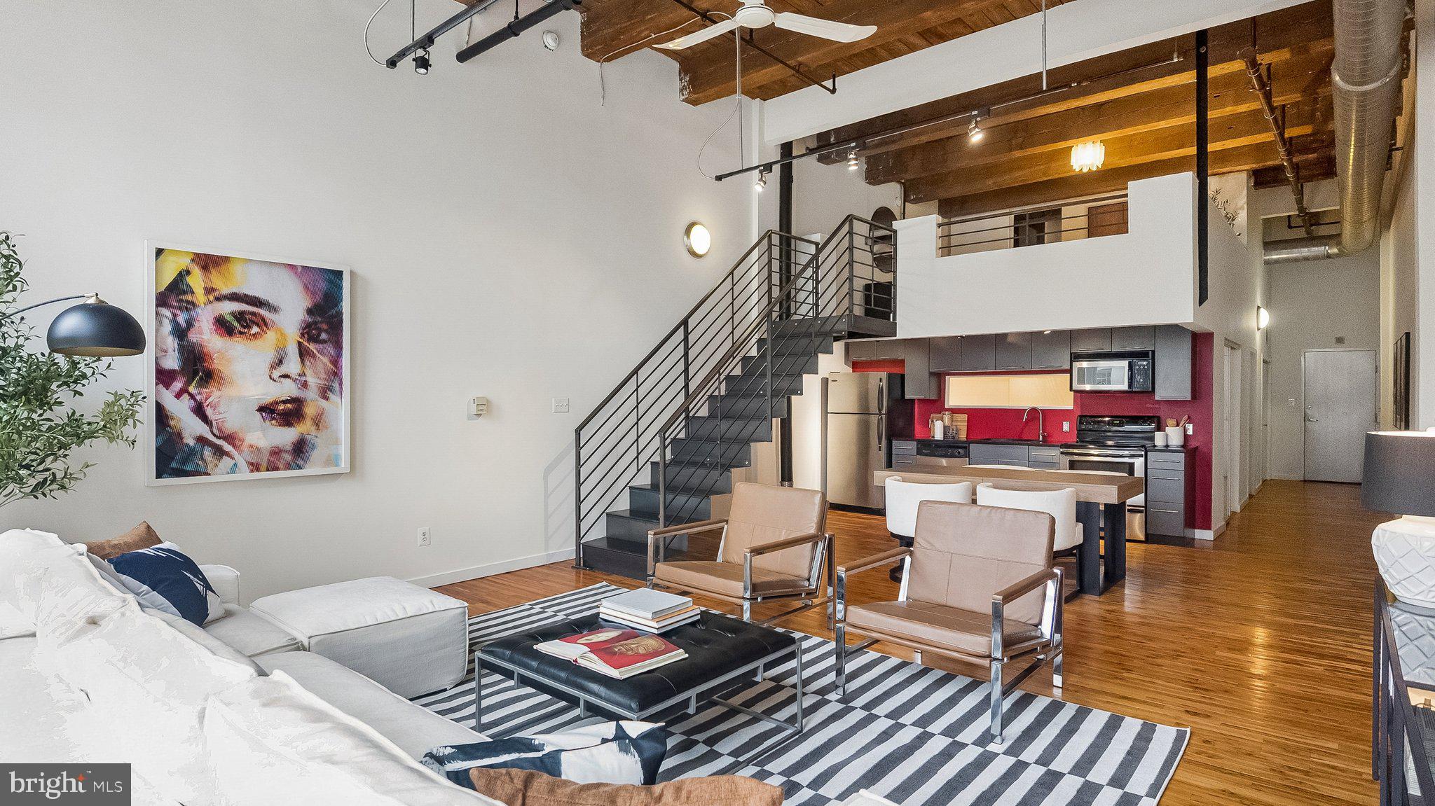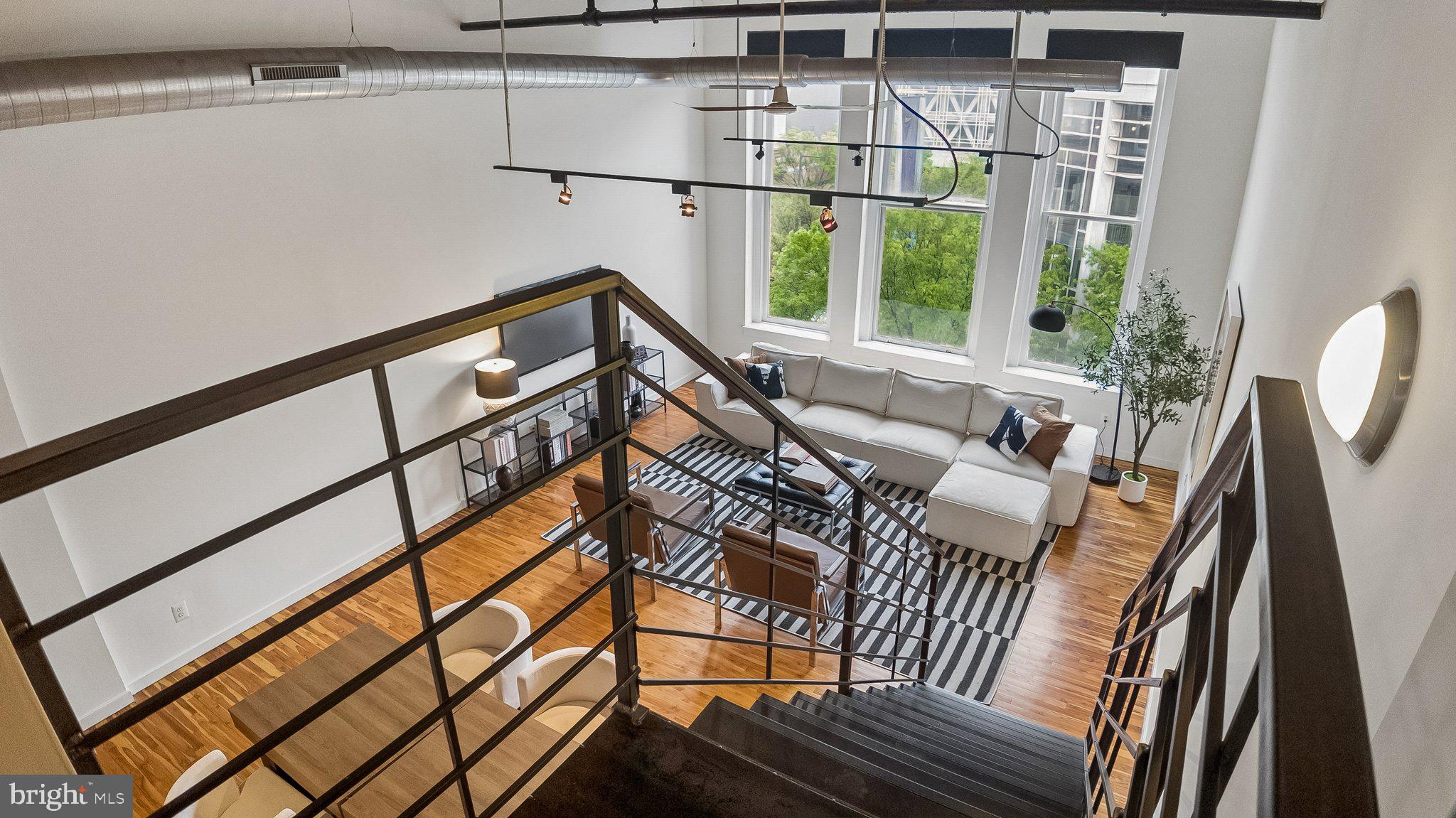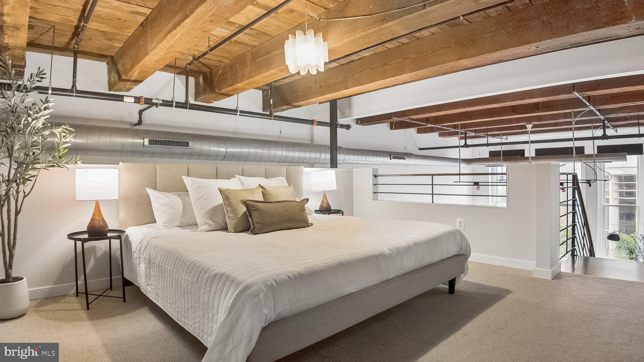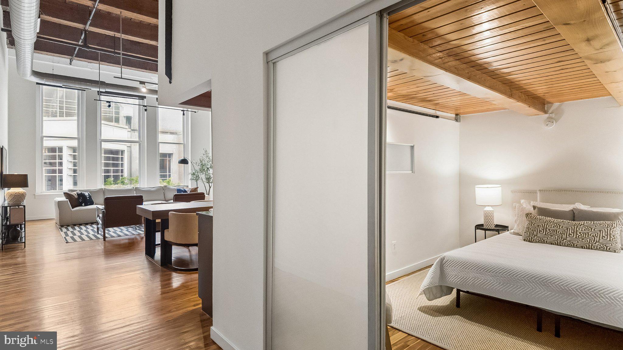 Amazing opportunity to own an industrial loft condo in the historic Pitcairn Building on the edge of Chinatown, across from the Convention Center and Reading Terminal Market (recently named the nation's top public market by USA Today)! This 3rd floor unit is drenched in sunlight! #302 is stunning with 18'+ wood ceilings, exposed beams and oversized windows with picturesque views of the iconic William Penn statue perched atop City Hall. The main floor features an open and bright living room, dining area, kitchen with granite countertops and stainless steel appliances, a spacious bedroom, full bathroom with tub shower and laundry area with a Bosch washer and dryer. This floor is complete with a bonus den/home office/storage area that most units in the building don't offer. The mezzanine is a private retreat with a bedroom, bathroom with a double sink vanity and a spacious shower and a walk-in closet. The building has secure access, a secure package room, and two high speed elevators. Great location with a walk score off 99! Mere steps from the Reading Terminal Market, Jefferson Train Station, and all that Chinatown has to offer, this condo is a 5-10 minute walk from literally hundreds of shops and restaurants in Old City, Midtown, and beyond.