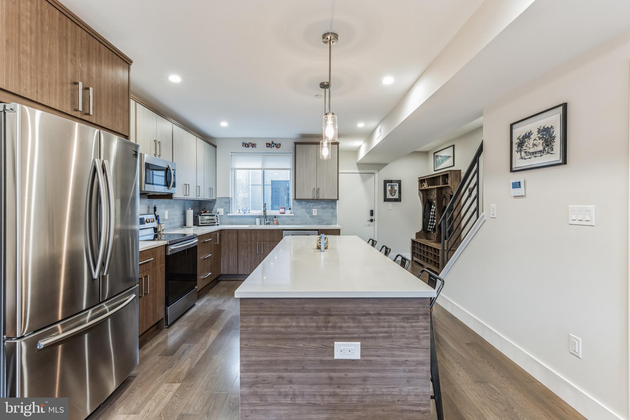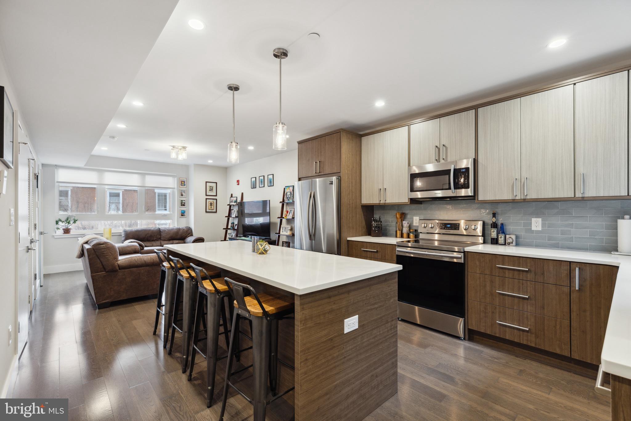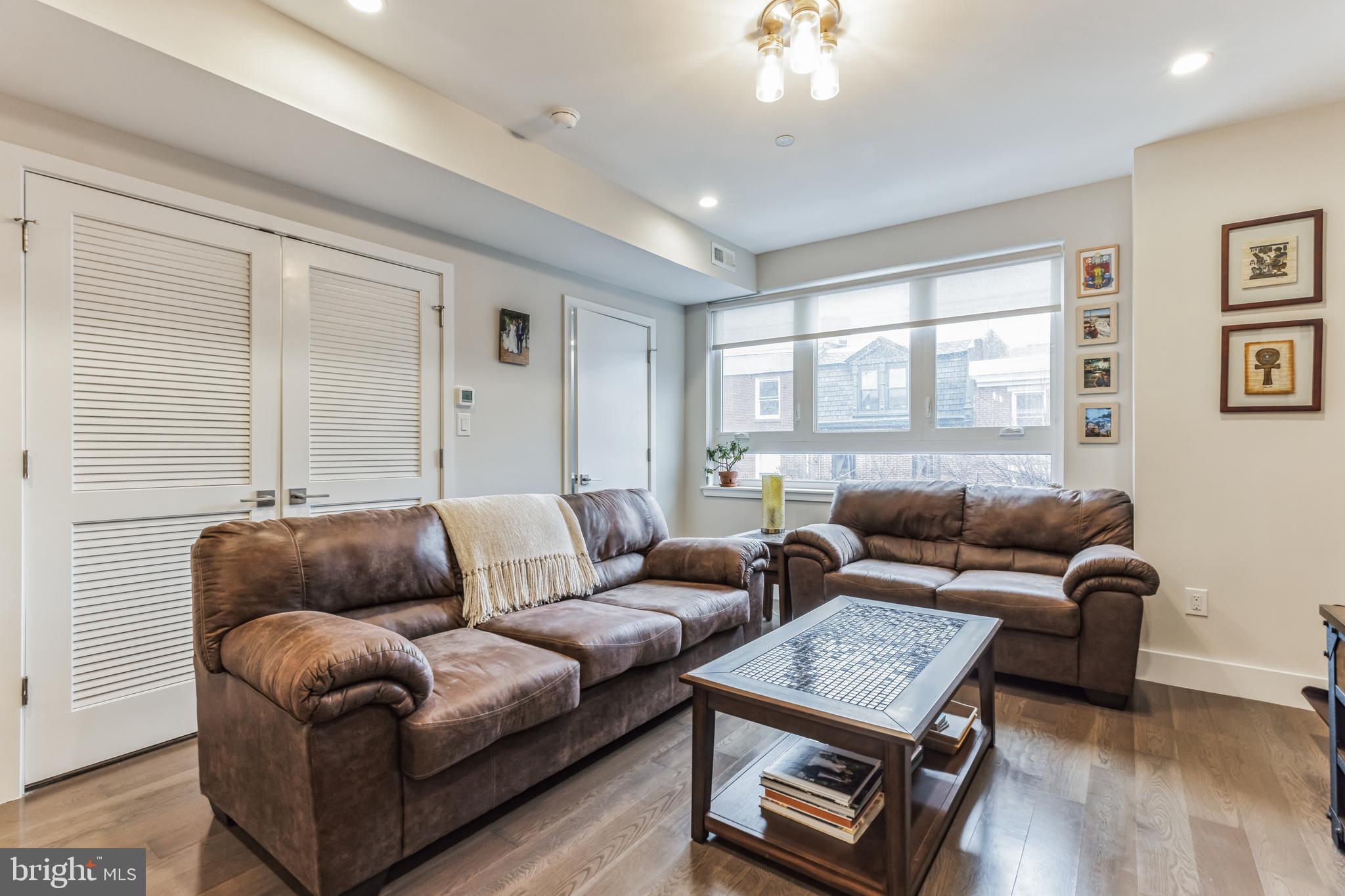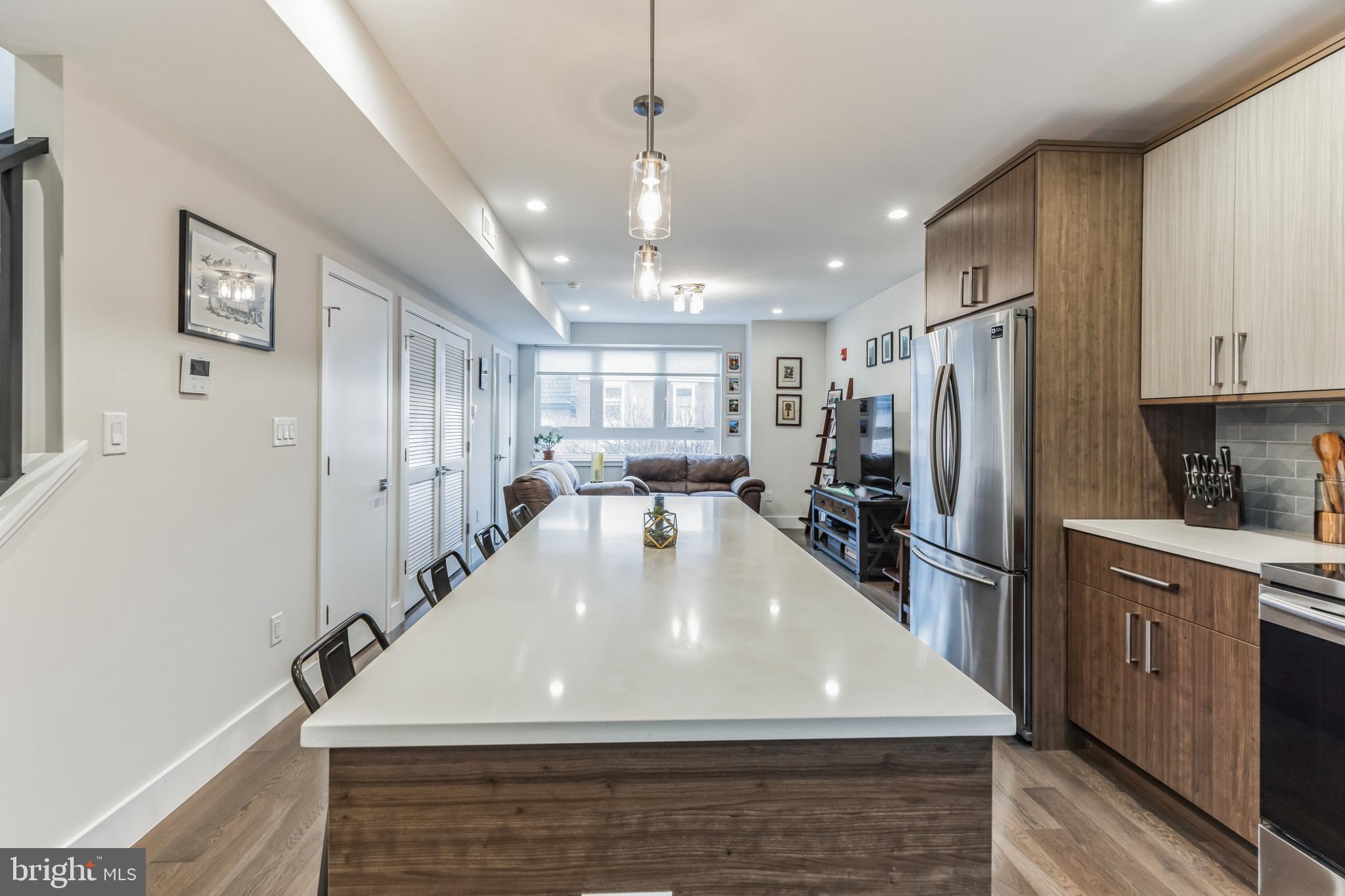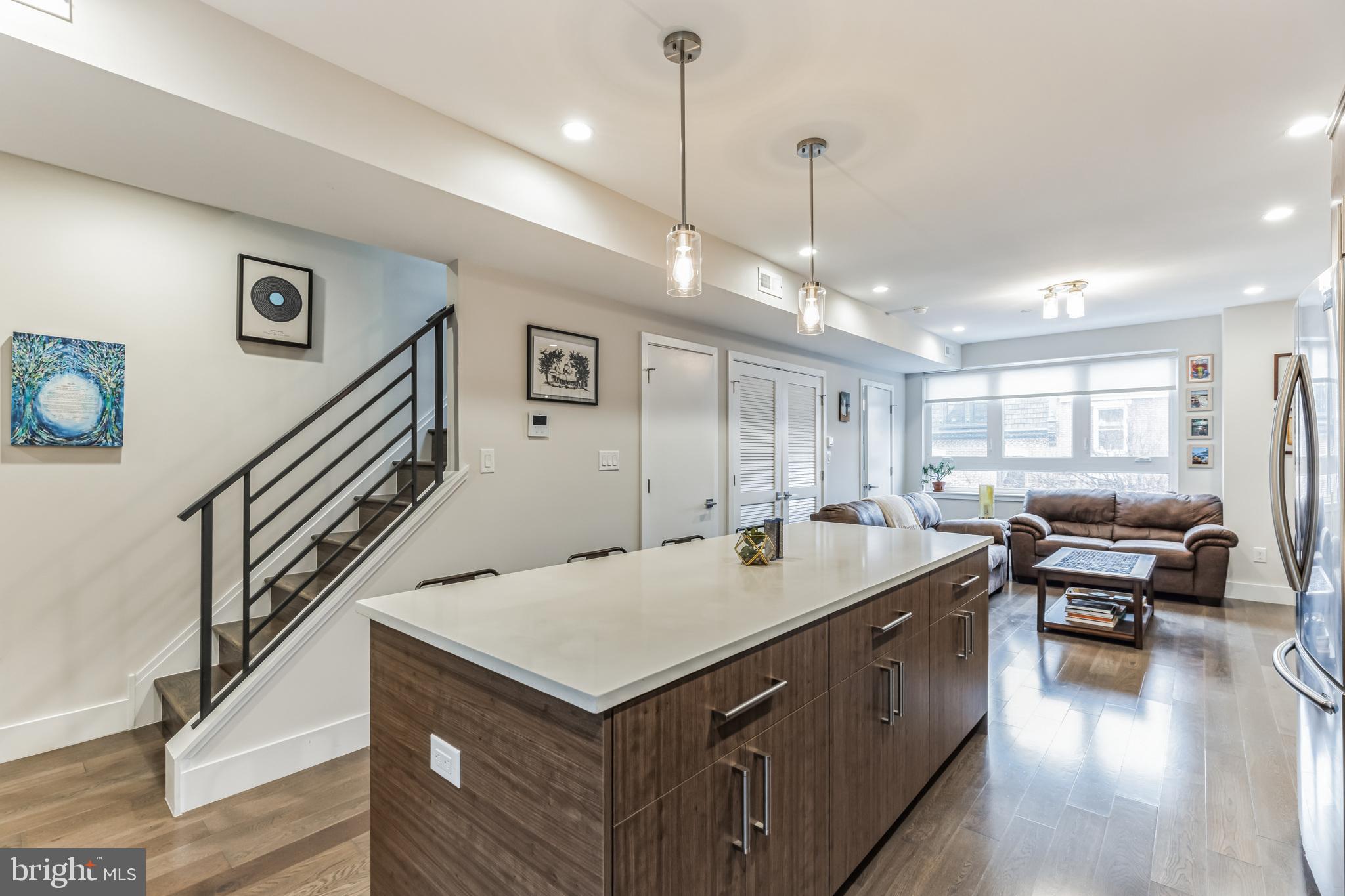 Introducing a rare bi-level condo in the heart of Fishtown. This 2 bedroom, 2.5 bathroom unit is like-new with five years left on the tax abatement! The entire home features custom Hunter Douglas window treatments and excellent condition hardwood floors throughout. The large kitchen has an incredible amount of storage space, including convenient drawer bases, a corner lazy susan cabinet, and a 96" island. Features like the semi-custom cabinetry, white quartz countertops, and icy blue tile backsplash make for a stylish place to cook, hang, and entertain. Everything, including the Samsung stainless steel appliances, are in like-new condition. As you continue past the kitchen, you'll find a spacious living room that floods with great natural light through large southeast facing windows. Also on the first level is a convenient half-bathroom and a laundry closet with front loading Samsung washer and dryer. Rounding out the first level is a surprising amount of storage space with custom closet built-ins underneath the stairs. Upstairs you will find that the natural light continues with an unexpected hallway skylight. Tucked away is a sophisticated primary suite featuring a 60" double vanity, a large shower with frameless glass enclosure, and custom closet systems. The spacious second bedroom features another large picture window and a custom closet system. Lastly, the large hall bathroom boasts it's own spa-like shower with frameless glass enclosure. Located just steps from green space like Palmer Park, this tree lined block is quiet despite proximity to the best bars and restaurants that Fishtown has to offer. A less than five minute walk will get you to Suraya, LMNO, Kalaya, Riverwards Market, and so much more! A quick walk to the Berks El stop will have you downtown in no time. Don't miss out on this gem!