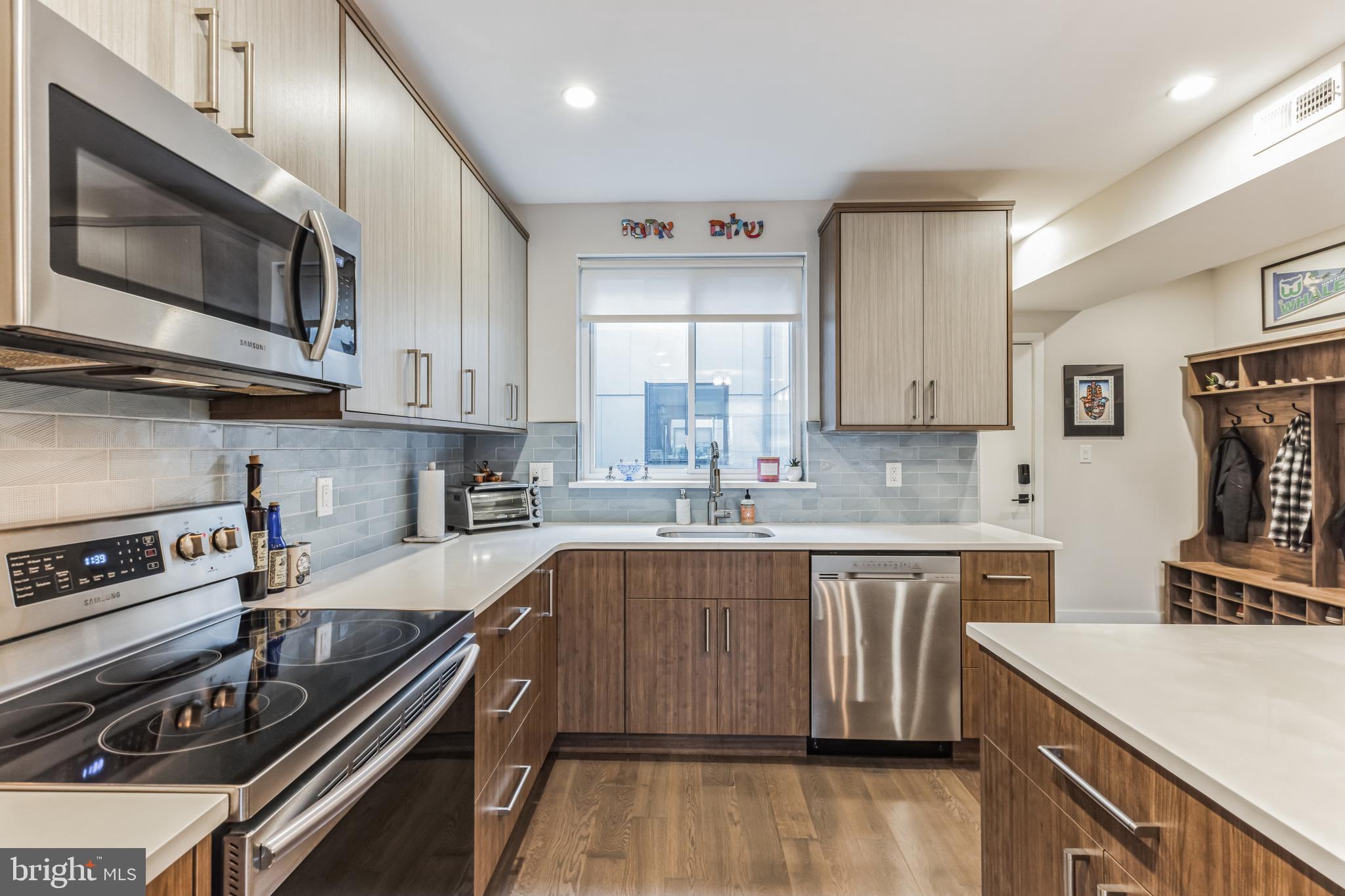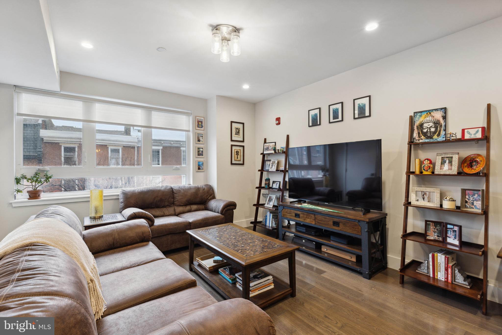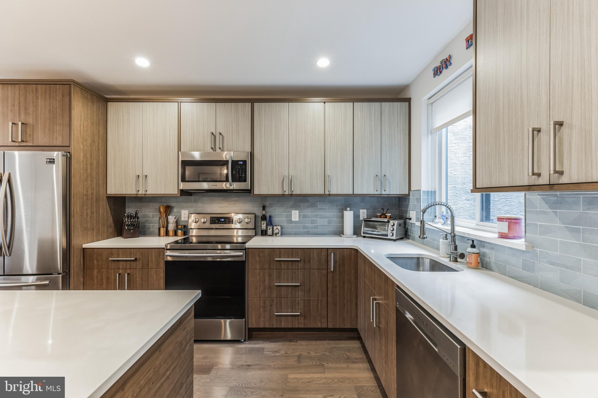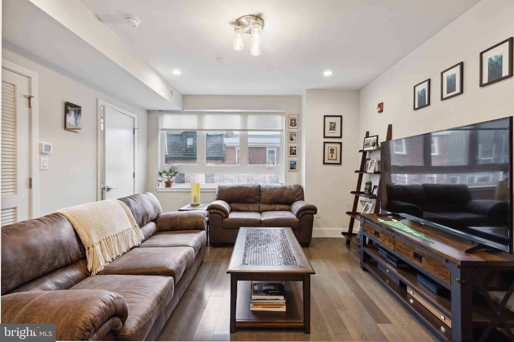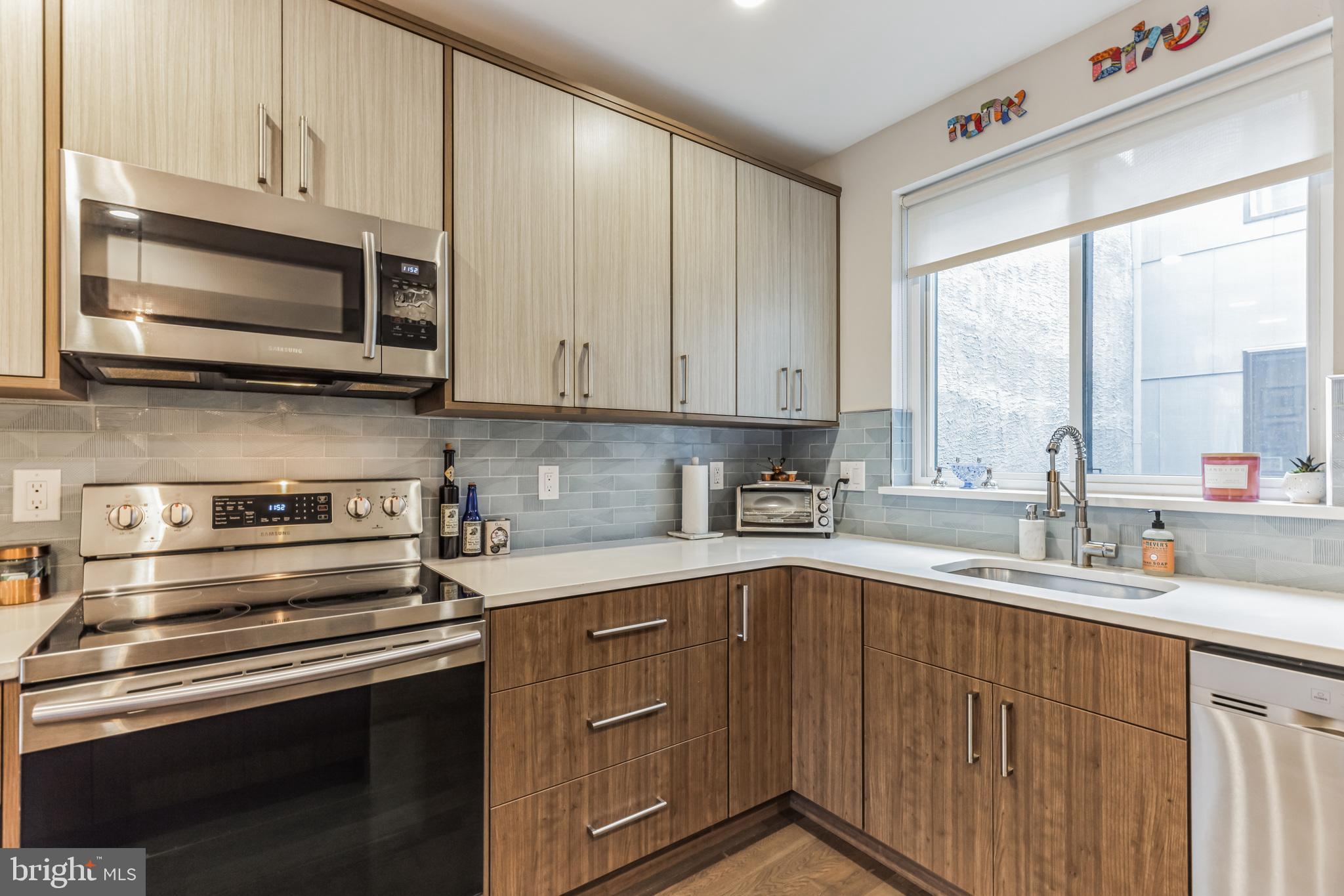 Introducing a rare bi-level condo in the heart of Fishtown. This 2 bedroom, 2.5 bathroom unit is like-new with five years left on the tax abatement! The entire home features custom Hunter Douglas window treatments and excellent condition hardwood floors throughout. The large kitchen has an incredible amount of storage space, including convenient drawer bases, a corner lazy susan cabinet, and a 96" island. Features like the semi-custom cabinetry, white quartz countertops, and icy blue tile backsplash make for a stylish place to cook, hang, and entertain. Everything, including the Samsung stainless steel appliances, are in like-new condition. As you continue past the kitchen, you'll find a spacious living room that floods with great natural light through large southeast facing windows. Also on the first level is a convenient half-bathroom and a laundry closet with front loading Samsung washer and dryer. Rounding out the first level is a surprising amount of storage space with custom closet built-ins underneath the stairs. Upstairs you will find that the natural light continues with an unexpected hallway skylight. Tucked away is a sophisticated primary suite featuring a 60" double vanity, a large shower with frameless glass enclosure, and custom closet systems. The spacious second bedroom features another large picture window and a custom closet system. Lastly, the large hall bathroom boasts it's own spa-like shower with frameless glass enclosure. Located just steps from green space like Palmer Park, this tree lined block is quiet despite proximity to the best bars and restaurants that Fishtown has to offer. A less than five minute walk will get you to Suraya, LMNO, Kalaya, Riverwards Market, and so much more! A quick walk to the Berks El stop will have you downtown in no time. Don't miss out on this gem!